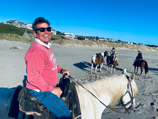 We moved onto the stables, mounted our trusty steeds, and clip-clopped single file through the grass-covered sand dune canyons, toward the beach.